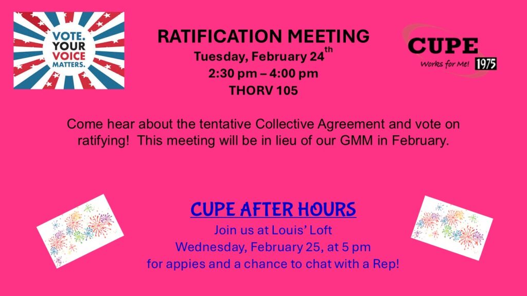 We are pleased to announce that the majority of the membership has accepted the recommendation of the CUPE 1975 Negotiating Committee and ratified the Memorandum of Settlement (MoS).