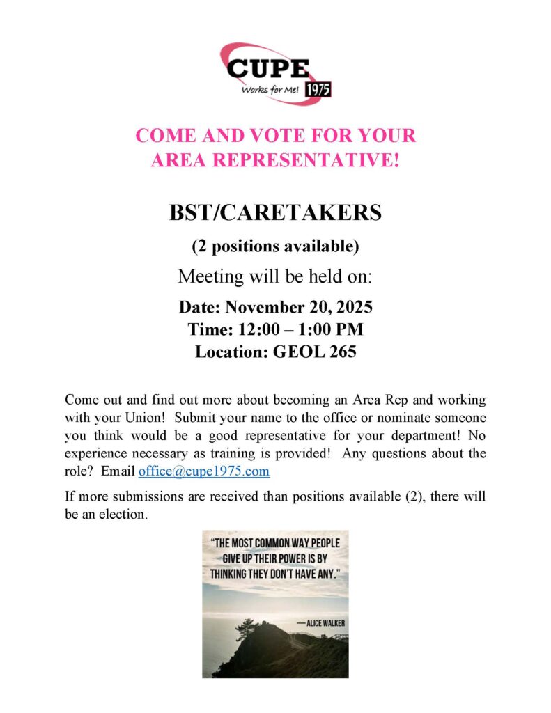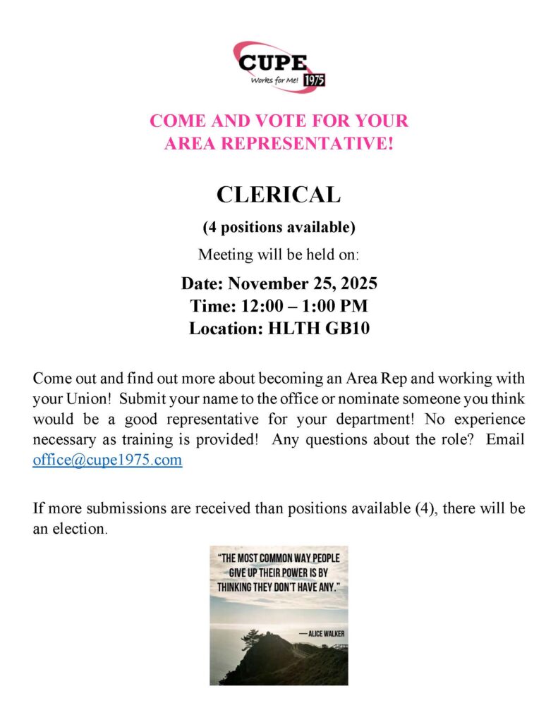 We will be having a by-election for the 2nd Vice President position that is now vacant. Nominations are now open until December 3, 2025. Contact the office for a nomination form.