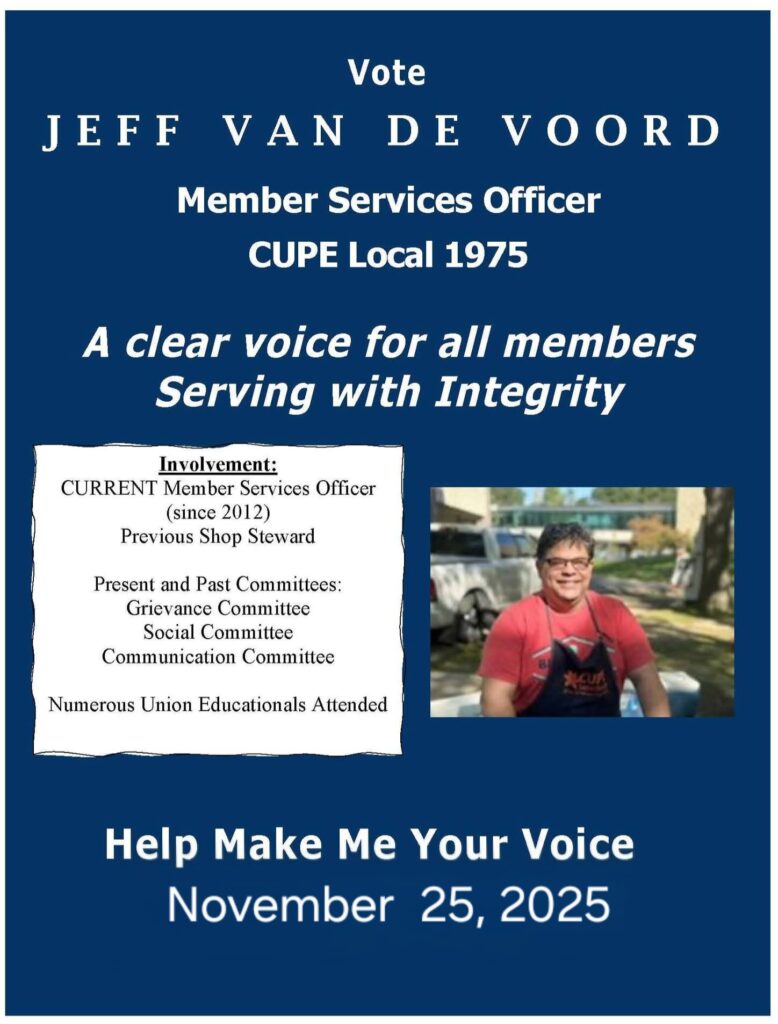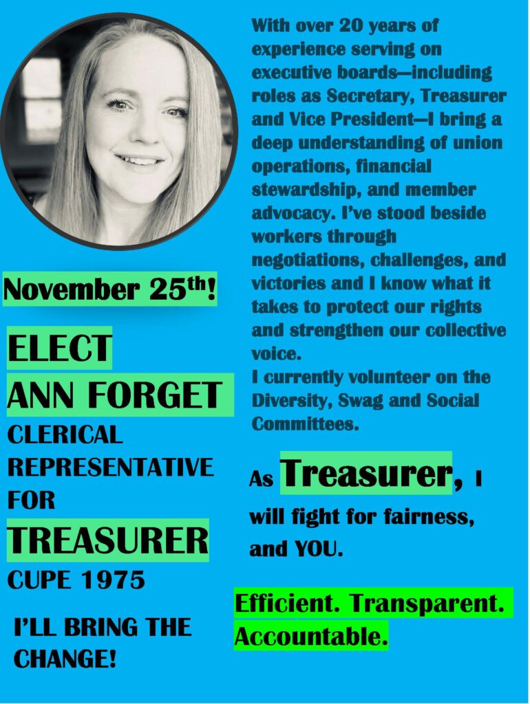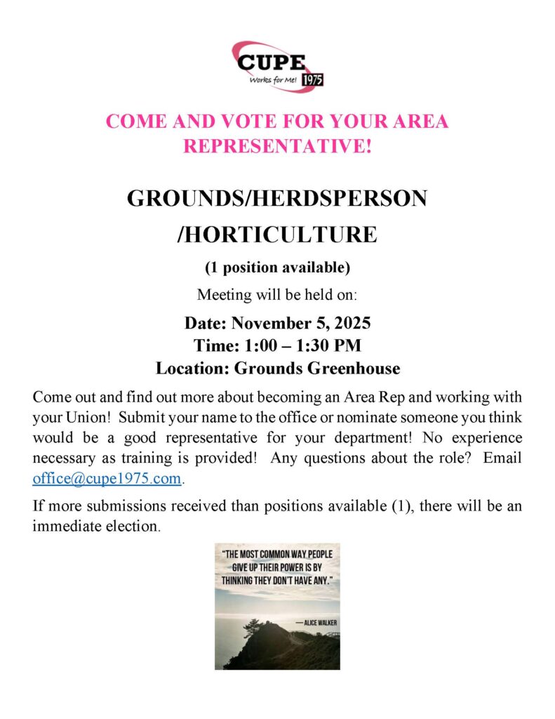 Anyone wishing to run for one of these positions will need to submit a nomination form, which is available at our CUPE 1975 office (Rm 21, McLean Hall) or attached below . Please submit the completed form to our office on or before 4:00 pm on Monday, October 27, 2025. Our office hours are 9-4 pm daily or you can submit via email at office@cupe1975.com.