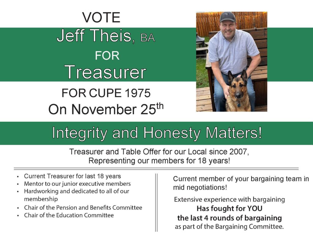 CUPE 1975 will once again be conducting its yearly elections in November. The positions up for election this year are 1st Vice-President, Treasurer and Membership Officer. The Table Officer positions are two-year terms and the Membership Officer is a one year term.